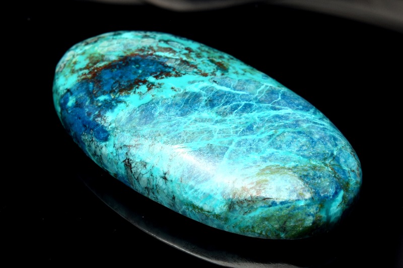 ブルーが本体の多くを占め、グリーンやブラウンなどのカラーが混ざり合って、出来ているため、丸く加工されたクリソコラは、宇宙から見た地球のような外観となっています。