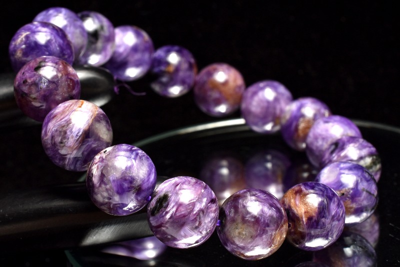 チャロアイトという名前の由来には、シベリアのチャロ川流域で発見された事とする説と、ロシア語の(Charo魅惑)から名づけられたという説がありますが、後者の方が有力であるとされています。その名の通り、この石の個性的な模様は、見る人を魅了してやみません。まさに、「魅惑の宝石」にぴったりな石です。
