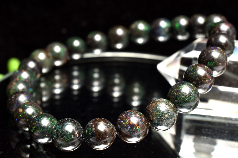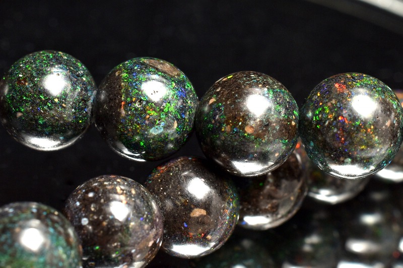 肉眼でも遊色は見られますが、強い光に当てると、まるで宇宙を見ているかのようにキラキラと煌めく美しいタイプ。