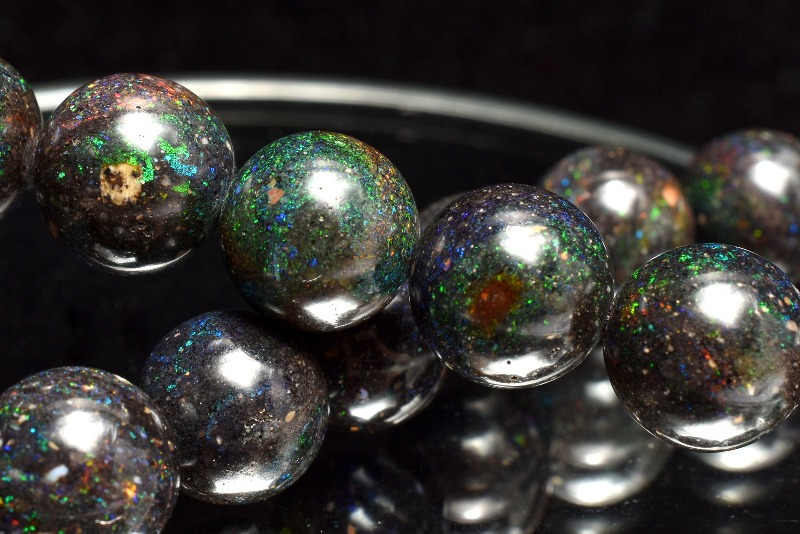 肉眼でも遊色は見られますが、強い光に当てると、まるで宇宙を見ているかのようにキラキラと煌めく美しいタイプ。