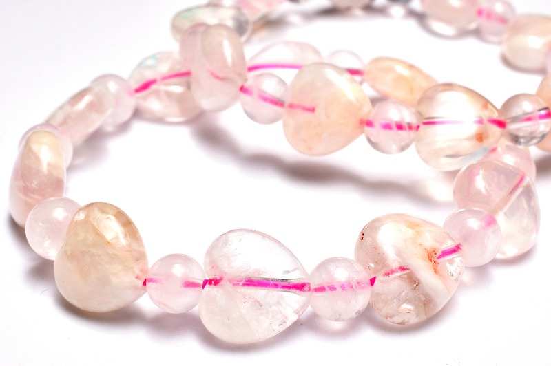 マダガスカル産の淡い色合いのローズクォーツに、セリサイト(絹雲母)が内包されています。