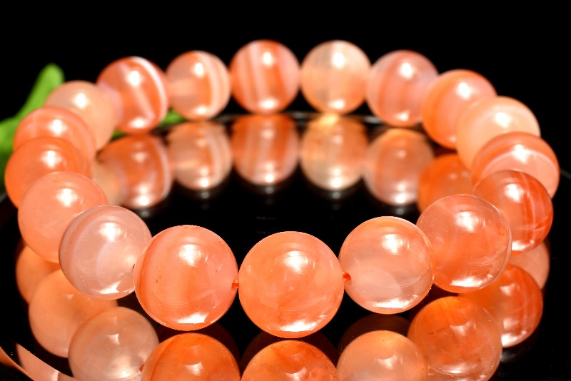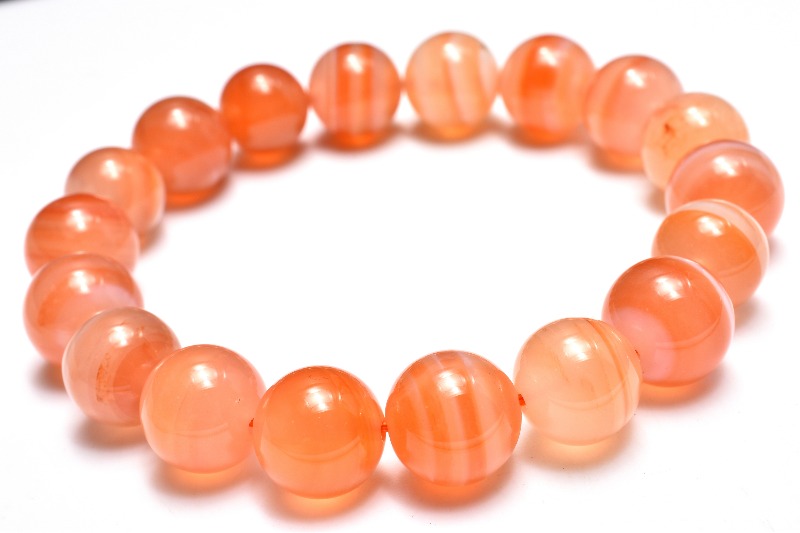 アゲート(めのう)の一種で、色合いはアイボリー、ベージュ、ブラウンなど落ち着いた色合いのものや、オレンジ、ピンクなども見られます。