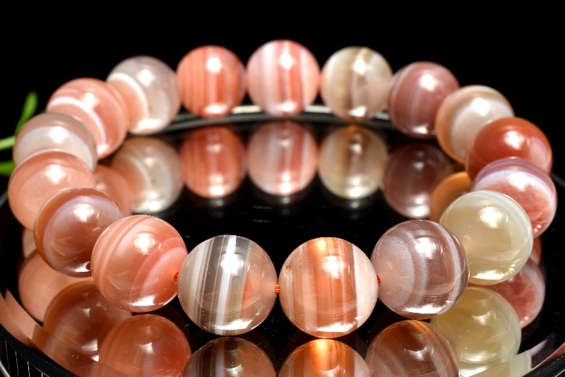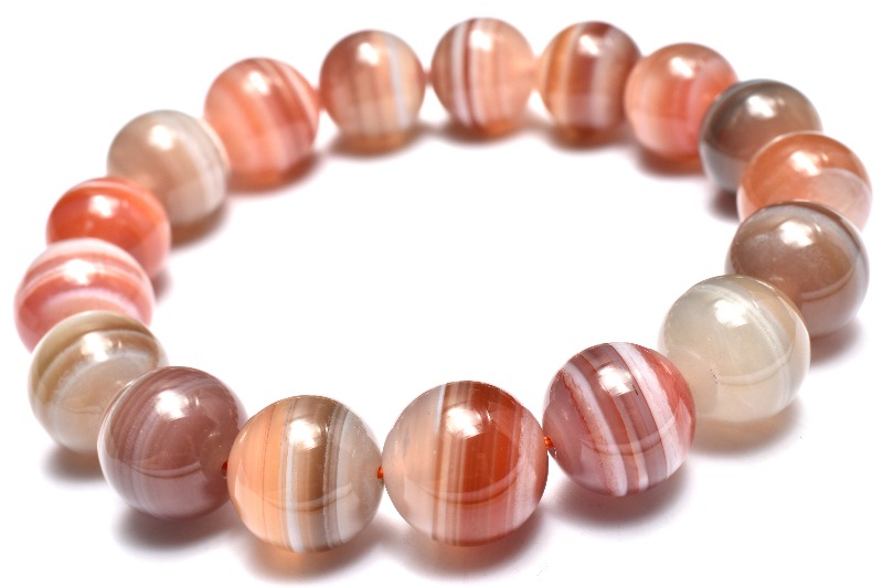 アゲート(めのう)の一種で、色合いはアイボリー、ベージュ、ブラウンなど落ち着いた色合いのものや、オレンジ、ピンクなども見られます。