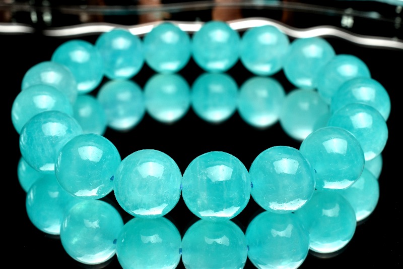 最近流通し始めたウイグル産アマゾナイトは鮮やかなブルーで透明感があります。石の強度を高くするために樹脂を浸透させる「タビライズド加工(含浸処理)」を施しており、この加工によって透明度が増しています。ロシアとペルー産はうまく浸透しないため、ウイグル産だけがこのような質感になるらしいです。