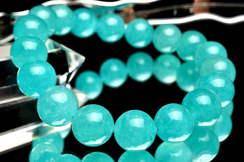 最近流通し始めたウイグル産アマゾナイトは鮮やかなブルーで透明感があります。石の強度を高くするために樹脂を浸透させる「タビライズド加工(含浸処理)」を施しており、この加工によって透明度が増しています。ロシアとペルー産はうまく浸透しないため、ウイグル産だけがこのような質感になるらしいです。
