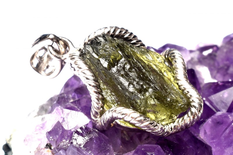 テクタイトは、遥か昔、地球に隕石が衝突した際に、その衝撃で地表の岩石が融解・飛散し、それらが冷やされてガラス質状に固まったものであるとされています。テクタイトは黒色ですが、モルダバイトは緑色、または褐色がかった透明で、ガラス光沢を放っています。
