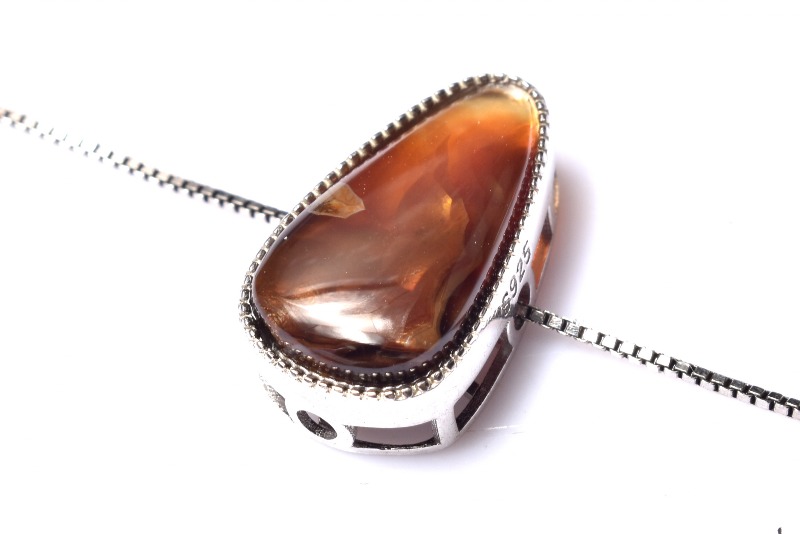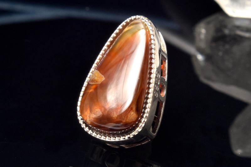 ファイアーアゲートはリモナイトなどを内包したカルセドニー(玉髄)の一種で、炎のようにゆらゆらと輝くことから、このような名前がつけられました。