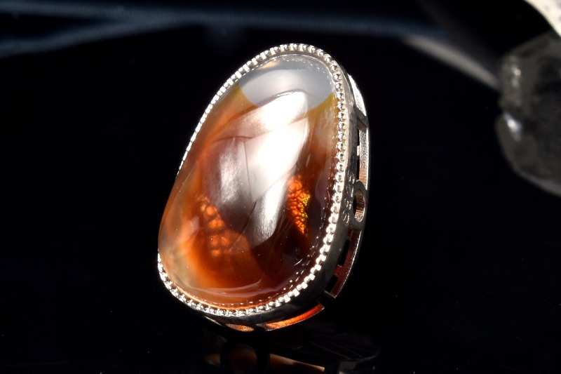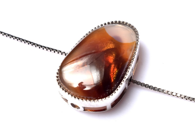 ファイアーアゲートはリモナイトなどを内包したカルセドニー(玉髄)の一種で、炎のようにゆらゆらと輝くことから、このような名前がつけられました。