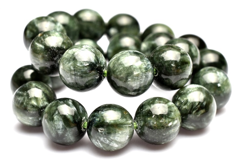 深緑色の地石の中に、白色〜銀色に輝く色彩の模様が「天使の羽」のように見えることがセラフィナイトの特徴です。