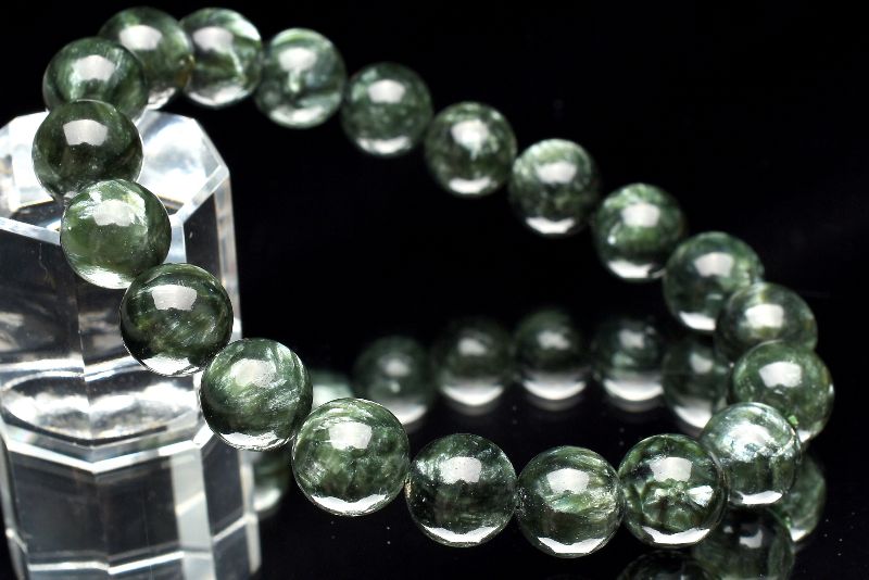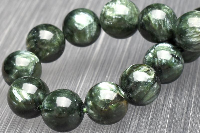 深緑色の地石の中に、白色〜銀色に輝く色彩の模様が「天使の羽」のように見えることがセラフィナイトの特徴です。