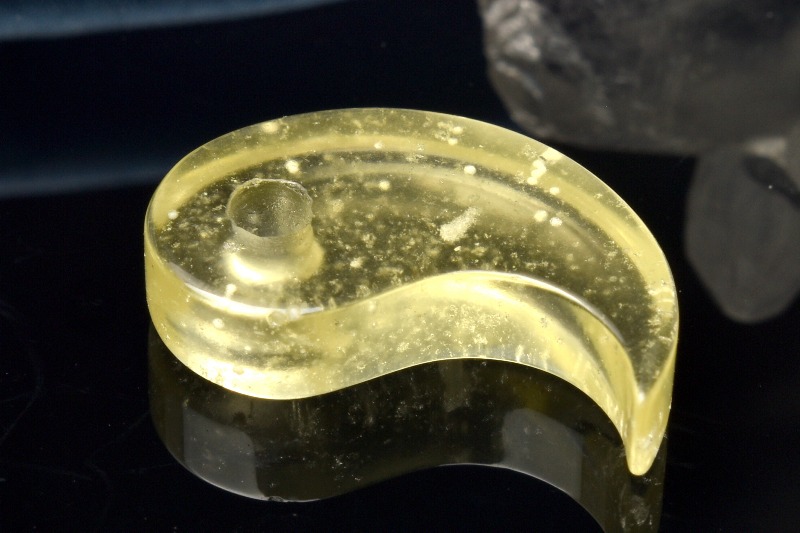 内部に鉄やニッケル等の隕石成分が混ざって発見されることもあるそうです。丸い気泡がバラバラに混在している中、溶融時に流れた模様が穏やかであることから、瞬時にしてガラス化したことがわかります。