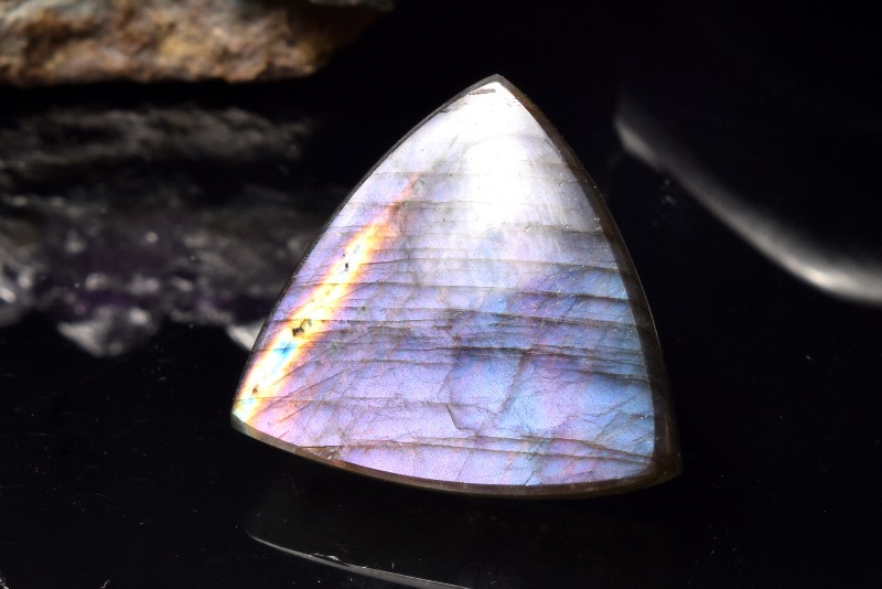 ラブラドライトの特色は、なんと言ってもその美しい閃光です。冷たそうでいて、非常に深みのある光は「ラブラドレッセンス(ラブラド光線)」と呼ばれます。