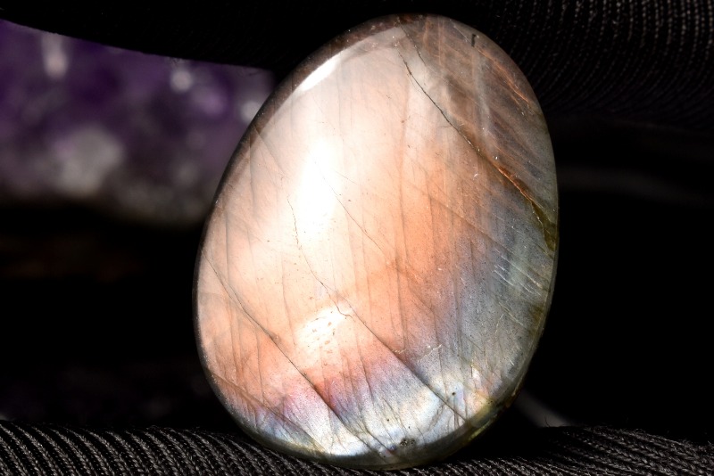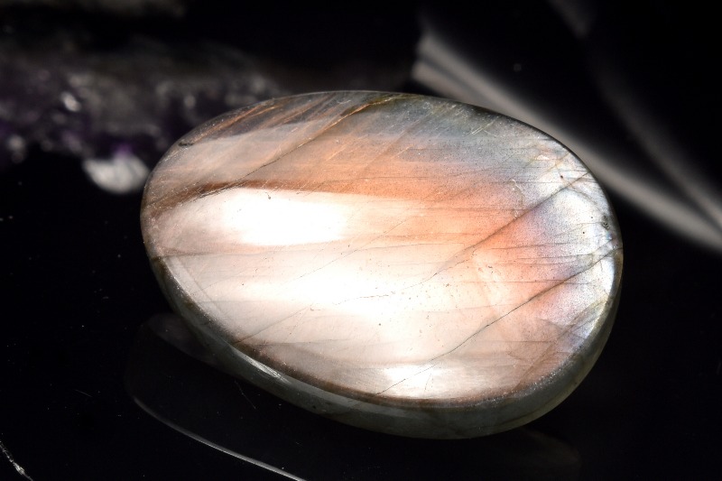 ラブラドライトの特色は、なんと言ってもその美しい閃光です。冷たそうでいて、非常に深みのある光は「ラブラドレッセンス(ラブラド光線)」と呼ばれます。