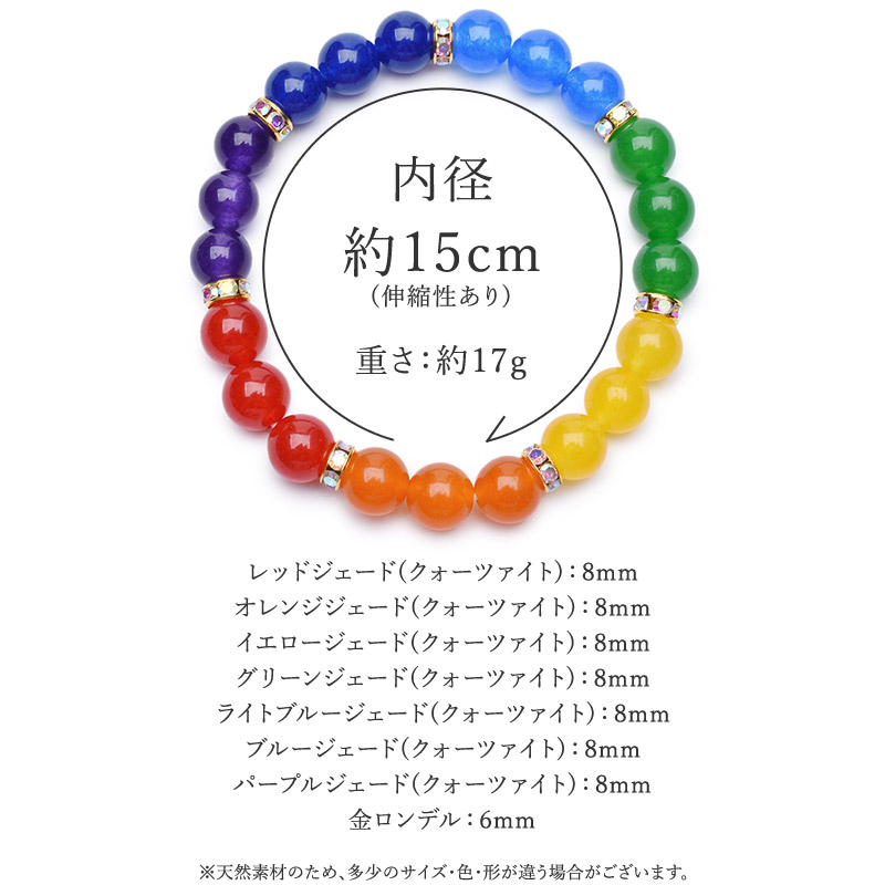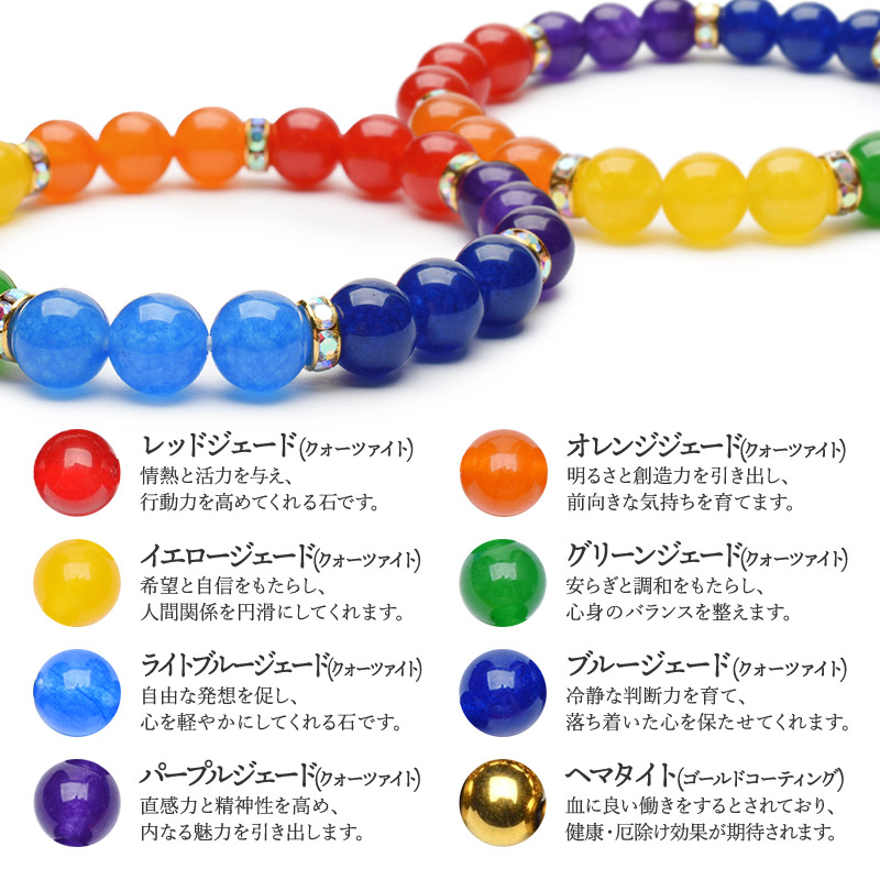 特徴・意味カラフルなジェードをグラデーションになるように配置し、アクセントにオーロラに光るロンデルを添えた華やかなブレスレットです。