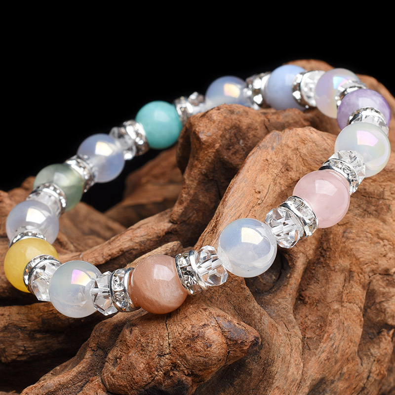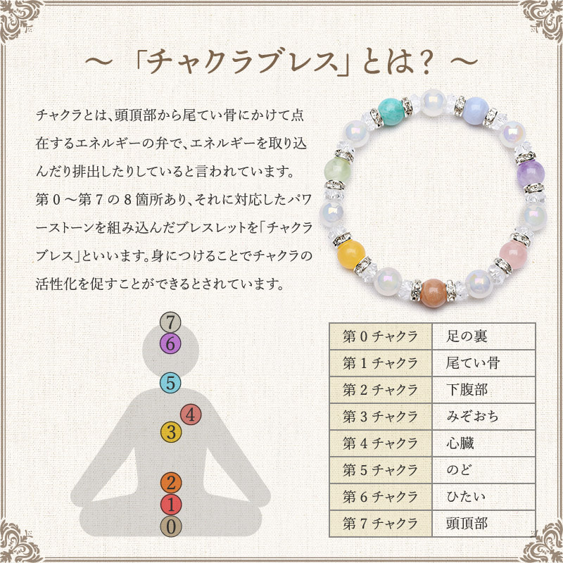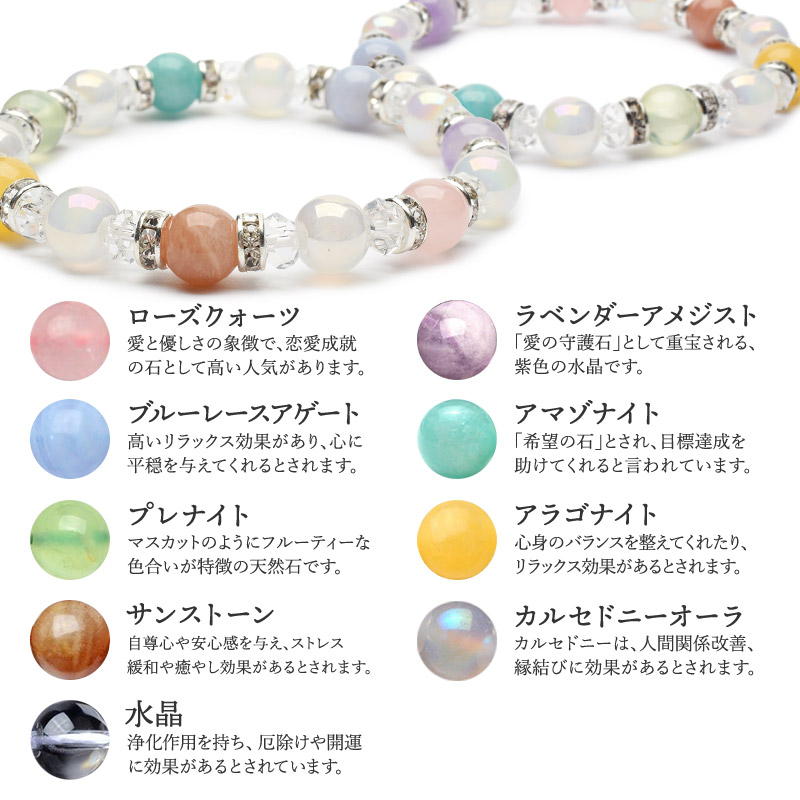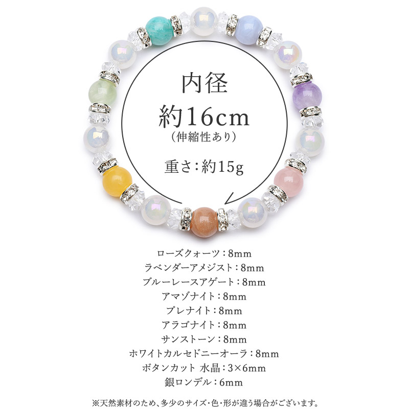 特徴・意味気分も明るくなるような発色の良い7色の天然石とオーラカルセドニーやカット水晶を組み合わせカラフルなデザインに仕上げました。