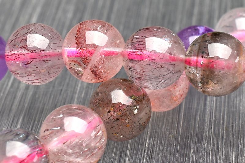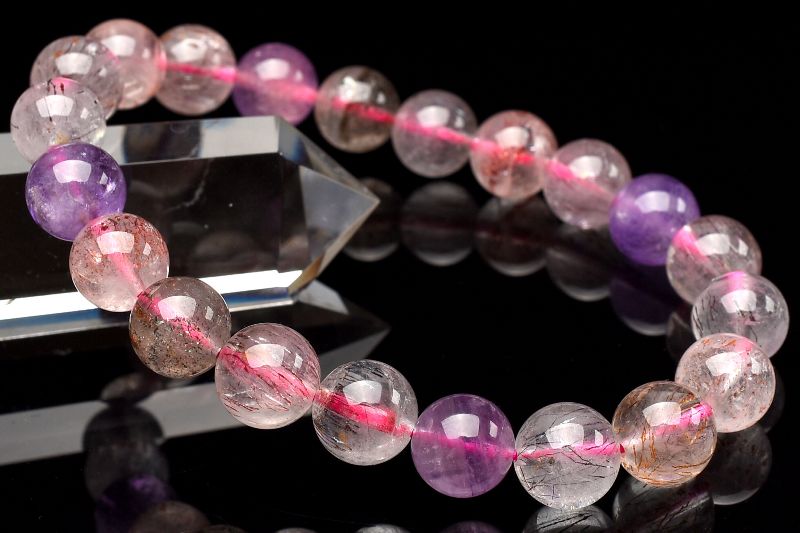 スーパーセブンは、ベースとなる水晶に、アメジスト、スモーキークォーツ、ルチルクォーツ、レピドクロサイト、カコクセナイト、ゲーサイトの合計7種類の鉱物が内包された天然石です。