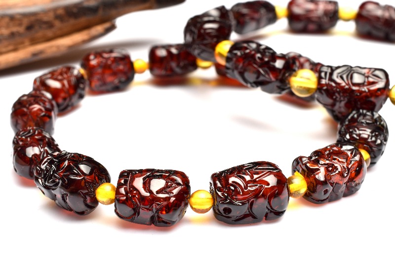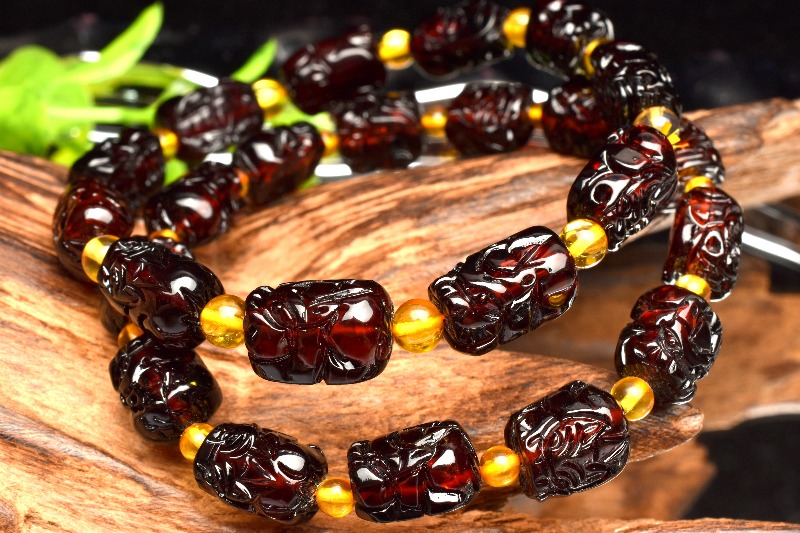 ミャンマー産 チェリーアンバー 10-14x8-10(丸玉4-5)mm 貔貅彫刻 ブレスレット 1個売り _BG5793