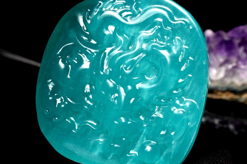 特徴・意味縁起物の彫刻が美しい高発色アマゾナイトです。