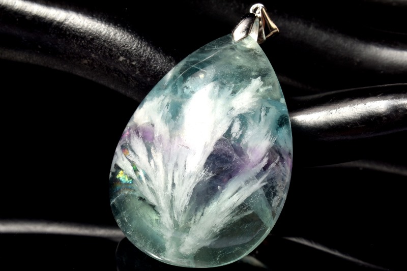 フェザーインフローライト(エンジェルフェザーフローライト・石花蛍石)は、フローライト(蛍石)の中に羽状の白い内包物が見られることからこう呼ばれています。