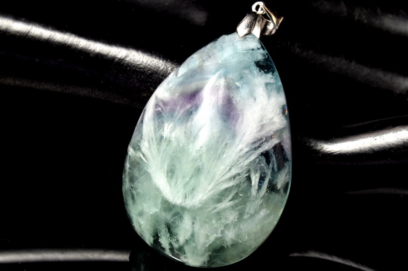 フェザーインフローライト(エンジェルフェザーフローライト・石花蛍石)は、フローライト(蛍石)の中に羽状の白い内包物が見られることからこう呼ばれています。