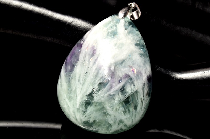 フェザーインフローライト(エンジェルフェザーフローライト・石花蛍石)は、フローライト(蛍石)の中に羽状の白い内包物が見られることからこう呼ばれています。