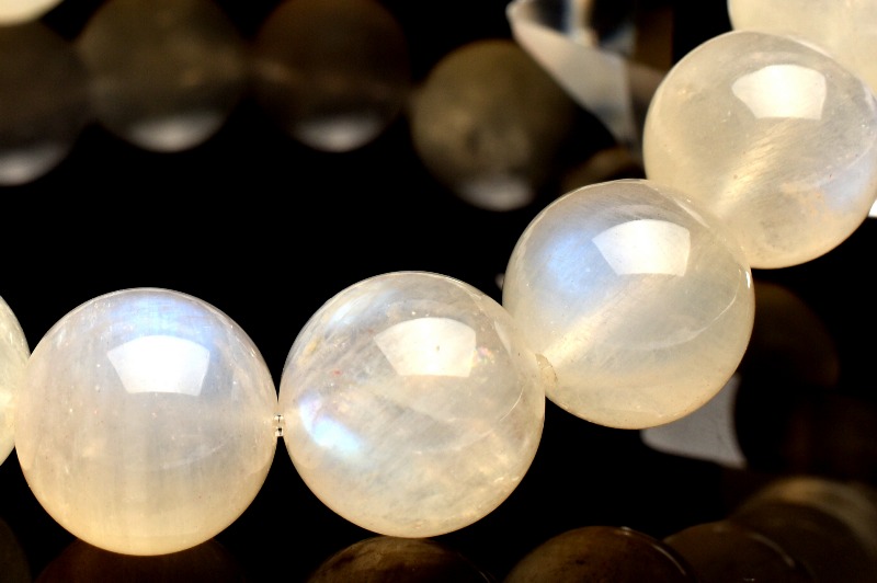 ムーンストーンは長石(フェルドスパー)という鉱物グループの一種。長石グループの石には、ラブラドライト、サンストーン、アマゾナイトなどがあり、同じ仲間とは思えないほど多種多様です。ムーンストーンはオーソクレース(正長石)を主とし、アルバイト(曹長石)を含むものをいい、この二種類の長石の層が重なり合って、光の内部反射と干渉が起こり、「シラー(シーン)」と呼ばれる幻想的な光の効果を見ることができます。この光こそがムーンストーンの最も特徴的な魅力でもあり、名前の元となるイメージをかきたてたのだと思います。一般的に知られるムーンストーンは乳白色、または半透明の物が多いようですが、他にもオレンジ、ピンク、イエロー、グリーン、灰色がかったグリーン、灰色、茶色、褐色など様々な色があります。