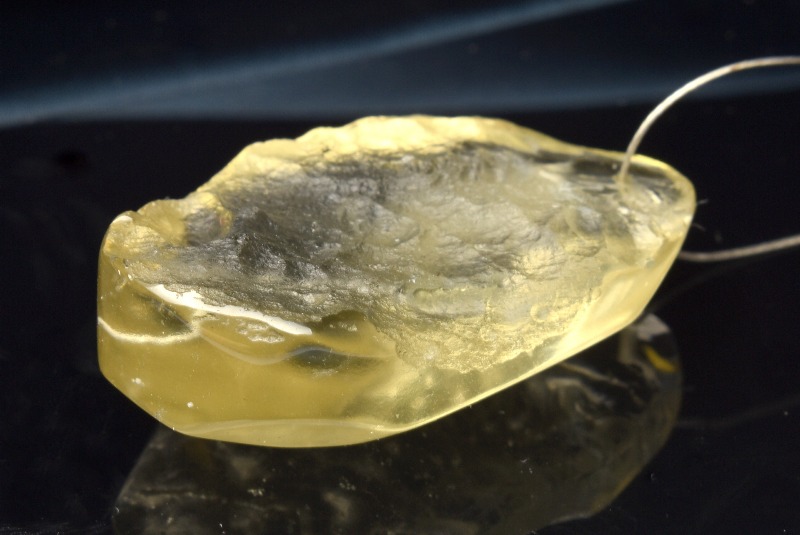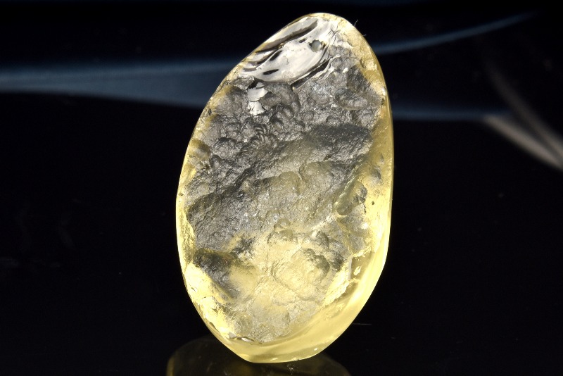 内部に鉄やニッケル等の隕石成分が混ざって発見されることもあるそうです。丸い気泡がバラバラに混在している中、溶融時に流れた模様が穏やかであることから、瞬時にしてガラス化したことがわかります。