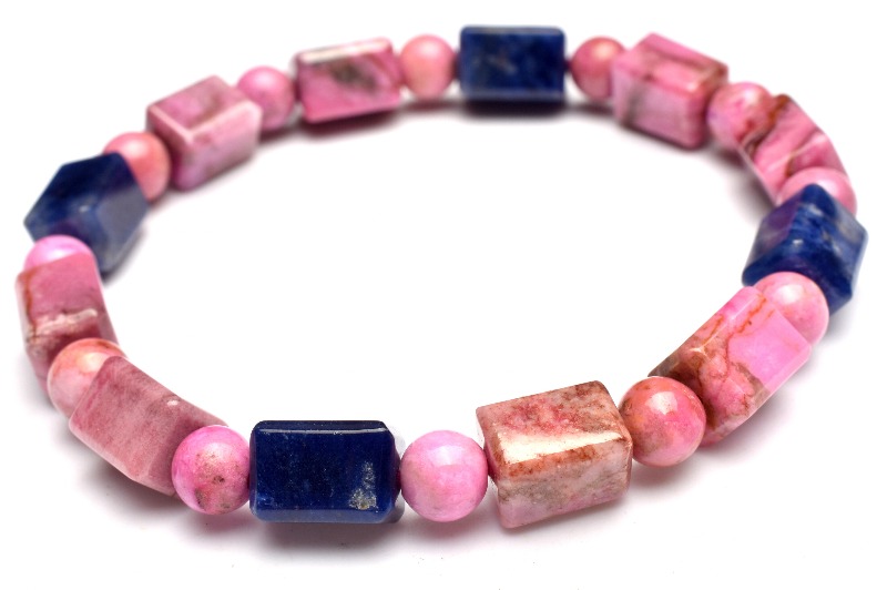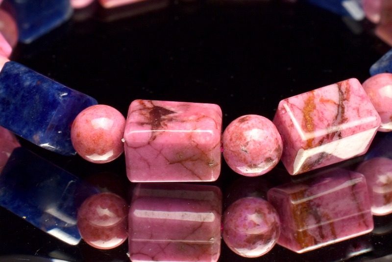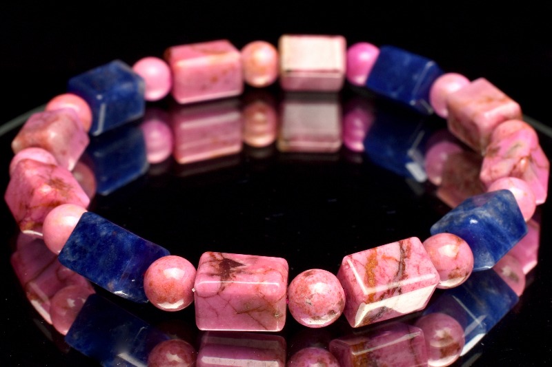 【1点物】5A級☆希少高発色 コバルトドロマイト(コバルトカルサイト)&ソーダライト 9-10x6.5-7(丸玉6)mm チューブカット ブレスレット _MA6073