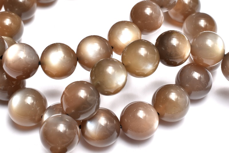 ムーンストーンは長石(フェルドスパー)という鉱物グループの一種。長石グループの石には、ラブラドライト、サンストーン、アマゾナイトなどがあり、同じ仲間とは思えないほど多種多様です。ムーンストーンはオーソクレース(正長石)を主とし、アルバイト(曹長石)を含むものをいい、この二種類の長石の層が重なり合って、光の内部反射と干渉が起こり、「シラー(シーン)」と呼ばれる幻想的な光の効果を見ることができます。この光こそがムーンストーンの最も特徴的な魅力でもあり、名前の元となるイメージをかきたてたのだと思います。一般的に知られるムーンストーンは乳白色、または半透明の物が多いようですが、他にもオレンジ、ピンク、イエロー、グリーン、灰色がかったグリーン、灰色、茶色、褐色など様々な色があります。