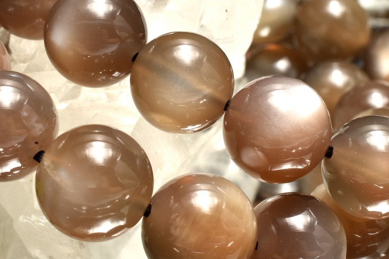 ムーンストーンは長石(フェルドスパー)という鉱物グループの一種。長石グループの石には、ラブラドライト、サンストーン、アマゾナイトなどがあり、同じ仲間とは思えないほど多種多様です。ムーンストーンはオーソクレース(正長石)を主とし、アルバイト(曹長石)を含むものをいい、この二種類の長石の層が重なり合って、光の内部反射と干渉が起こり、「シラー(シーン)」と呼ばれる幻想的な光の効果を見ることができます。この光こそがムーンストーンの最も特徴的な魅力でもあり、名前の元となるイメージをかきたてたのだと思います。一般的に知られるムーンストーンは乳白色、または半透明の物が多いようですが、他にもオレンジ、ピンク、イエロー、グリーン、灰色がかったグリーン、灰色、茶色、褐色など様々な色があります。