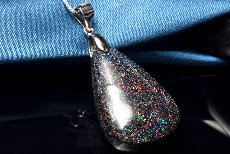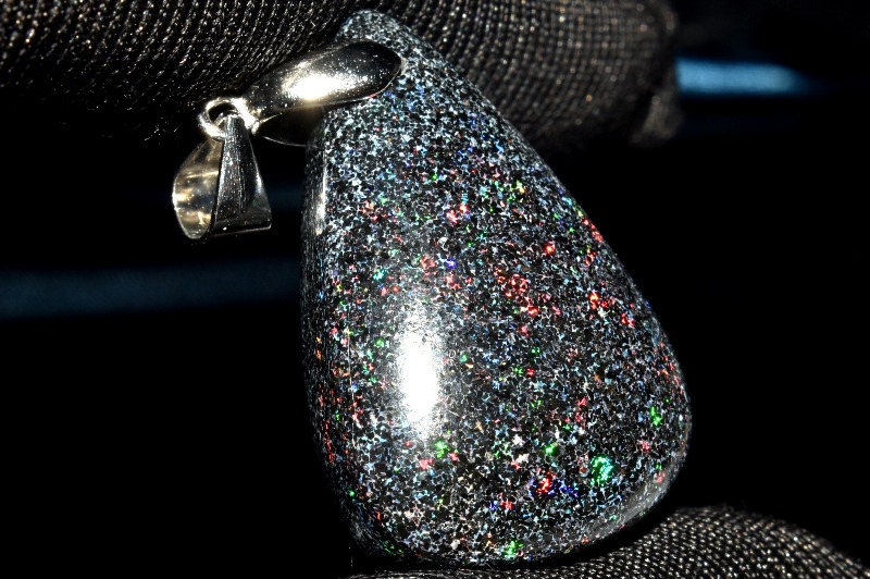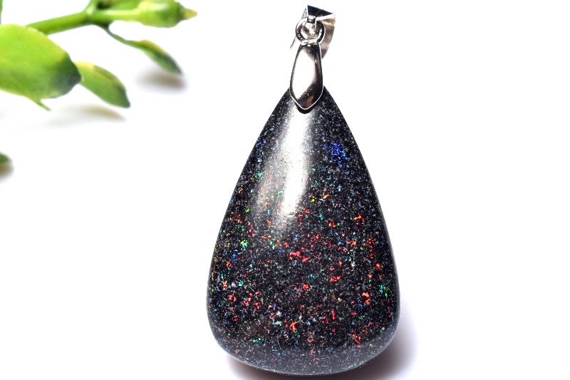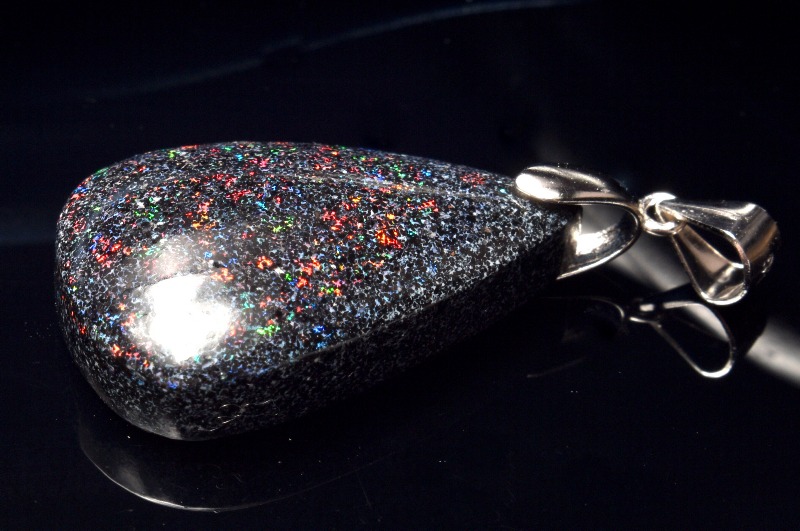 肉眼でも遊色は見られますが、強い光に当てると、まるで宇宙を見ているかのようにキラキラと煌めく美しいタイプ。