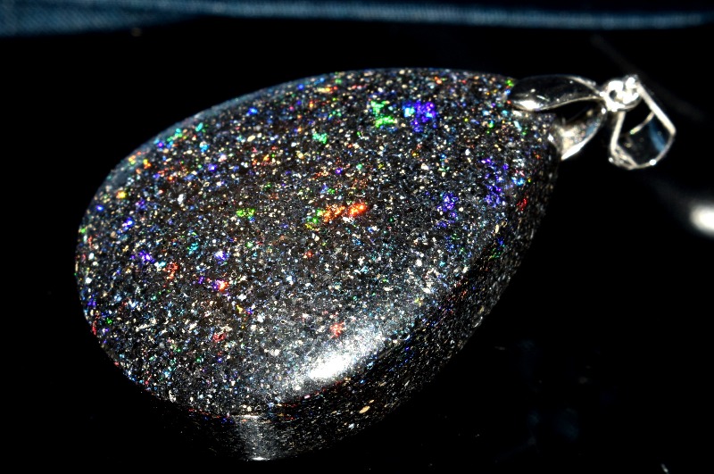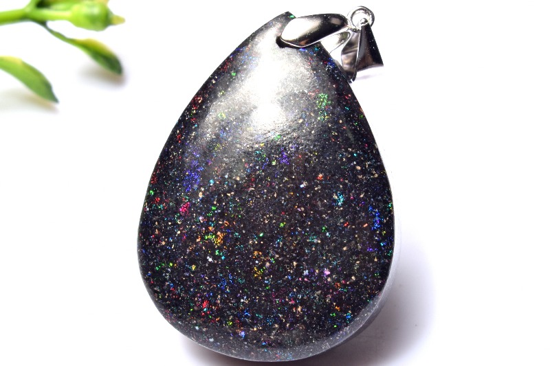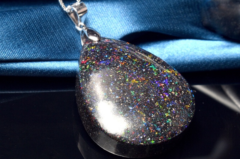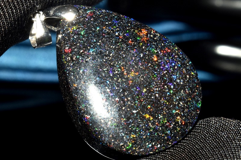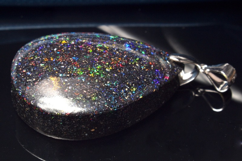 肉眼でも遊色は見られますが、強い光に当てると、まるで宇宙を見ているかのようにキラキラと煌めく美しいタイプ。