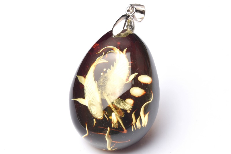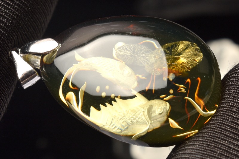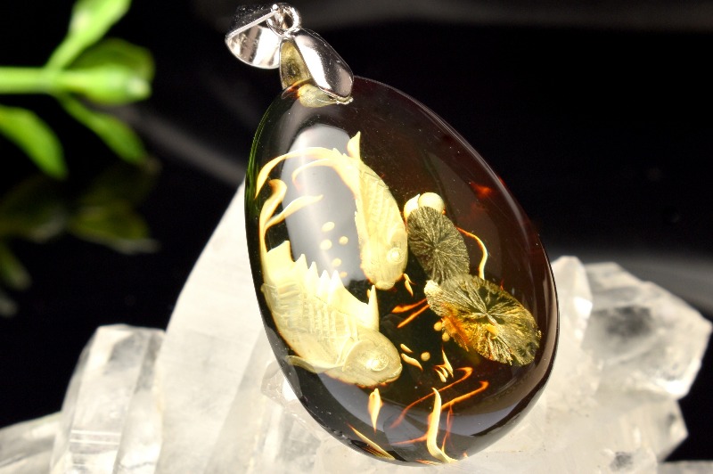 【1点物】Silver925◇繊細彫刻 ブルーアンバー 29x21mm 錦鯉内彫りドロップ ペンダントトップ _PC4780