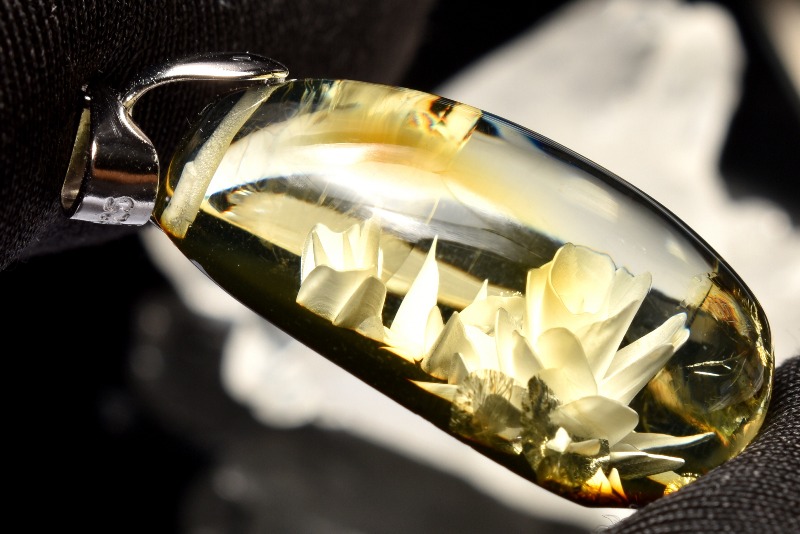 通常のブルーアンバーは金色や赤茶色などのような色合いですが、わずかな太陽の光にも反応し角度によって鮮やかな青色や緑色に輝きます。