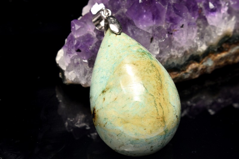 青色から緑色の色を持つ不透明な鉱物である。化学的には水酸化銅アルミニウム燐酸塩です。