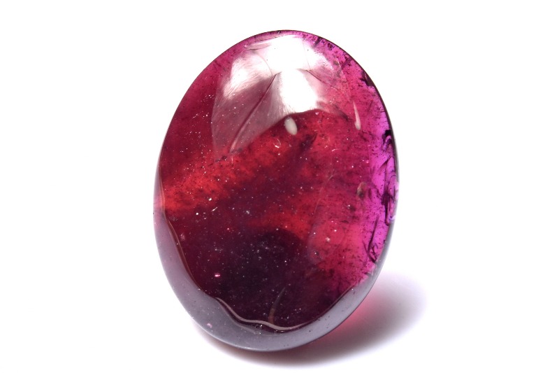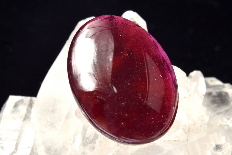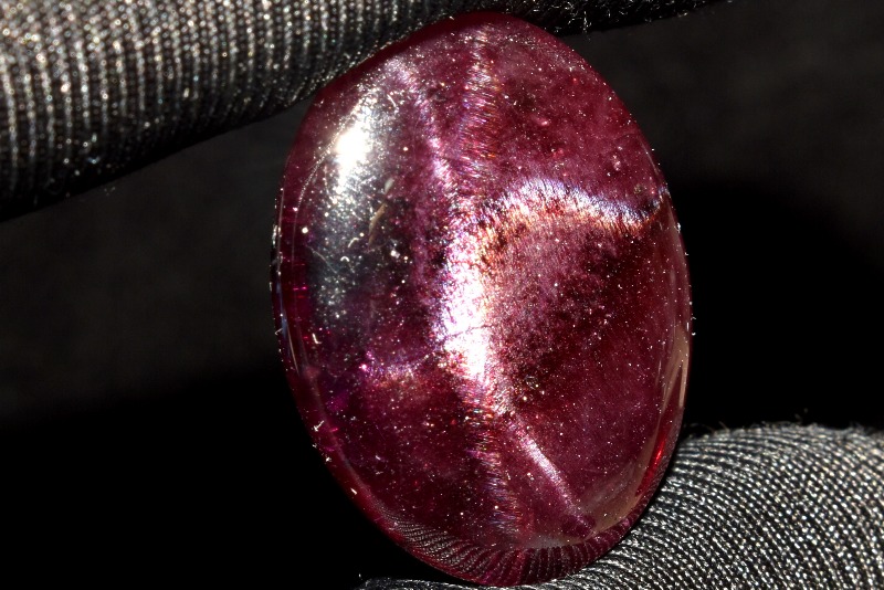 スターガーネットは金紅石(ルチル)や角閃石など針状の結晶を含むことで4条あるいは6条のスターが浮かび上がる、アルマンディンという種類のガーネットです。どんな石でもスターがでるというものではなく、針状結晶の多いものを正しく加工することでスター効果があらわれます。