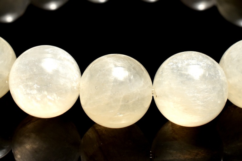ムーンストーンは長石(フェルドスパー)という鉱物グループの一種。長石グループの石には、ラブラドライト、サンストーン、アマゾナイトなどがあり、同じ仲間とは思えないほど多種多様です。ムーンストーンはオーソクレース(正長石)を主とし、アルバイト(曹長石)を含むものをいい、この二種類の長石の層が重なり合って、光の内部反射と干渉が起こり、「シラー(シーン)」と呼ばれる幻想的な光の効果を見ることができます。この光こそがムーンストーンの最も特徴的な魅力でもあり、名前の元となるイメージをかきたてたのだと思います。一般的に知られるムーンストーンは乳白色、または半透明の物が多いようですが、他にもオレンジ、ピンク、イエロー、グリーン、灰色がかったグリーン、灰色、茶色、褐色など様々な色があります。