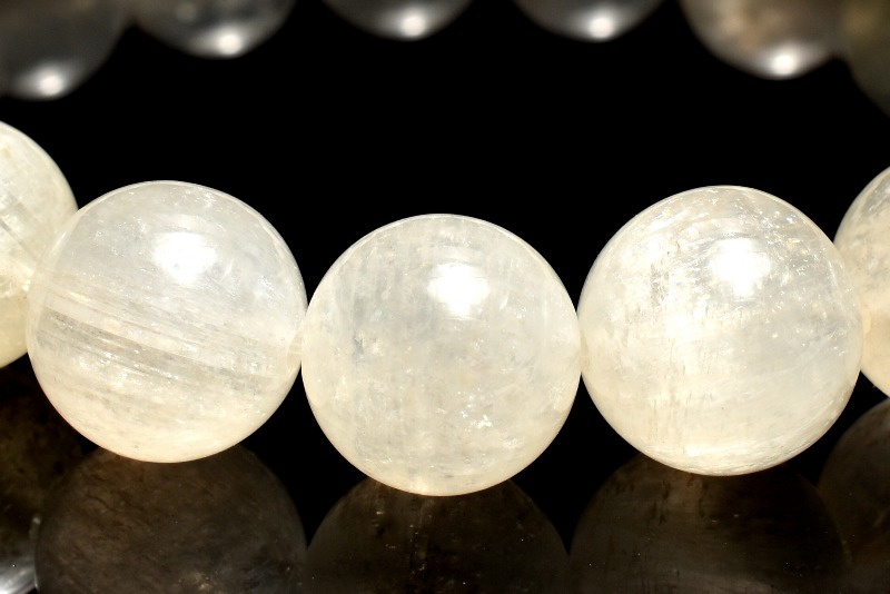 ムーンストーンは長石(フェルドスパー)という鉱物グループの一種。長石グループの石には、ラブラドライト、サンストーン、アマゾナイトなどがあり、同じ仲間とは思えないほど多種多様です。ムーンストーンはオーソクレース(正長石)を主とし、アルバイト(曹長石)を含むものをいい、この二種類の長石の層が重なり合って、光の内部反射と干渉が起こり、「シラー(シーン)」と呼ばれる幻想的な光の効果を見ることができます。この光こそがムーンストーンの最も特徴的な魅力でもあり、名前の元となるイメージをかきたてたのだと思います。一般的に知られるムーンストーンは乳白色、または半透明の物が多いようですが、他にもオレンジ、ピンク、イエロー、グリーン、灰色がかったグリーン、灰色、茶色、褐色など様々な色があります。