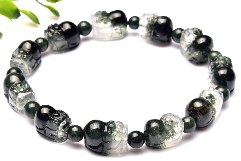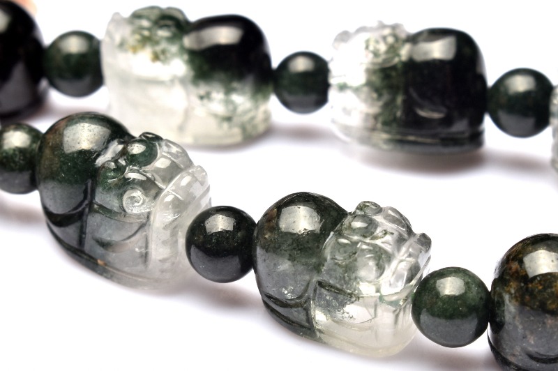 【1点物】半々タイプ◇繊細彫刻 グリーンガーデンクォーツ 11-12.5x7-8.5(丸玉5)mm 貔貅彫刻 ブレスレット _MA6691