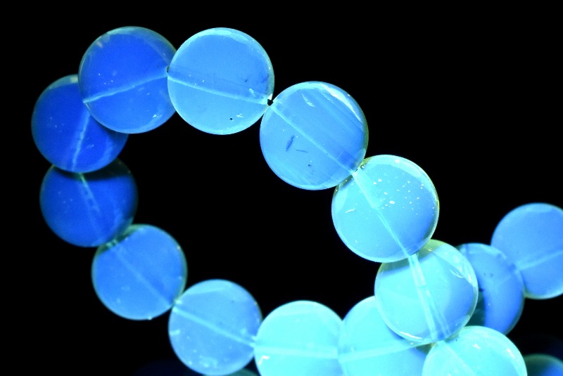 紫外線を当てると透明感のあるブルーに輝き神秘さを感じます。