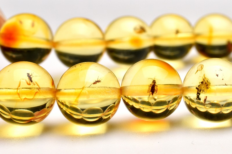 サイズ・種類も様々な昆虫が閉じ込められた天然琥珀のブレスレットです。