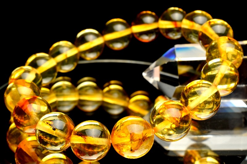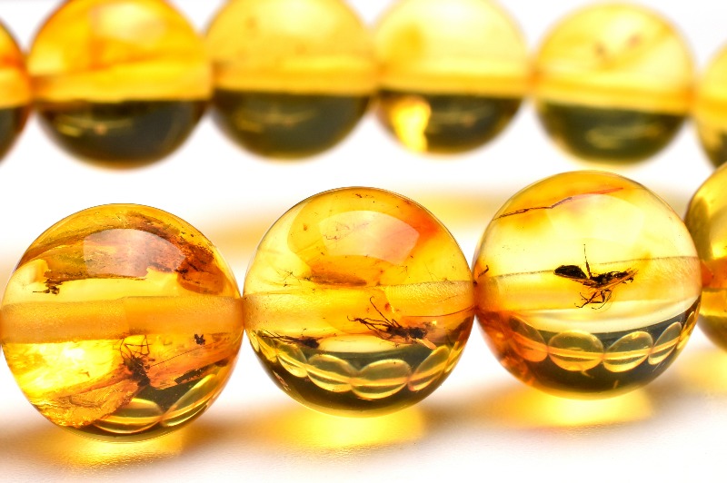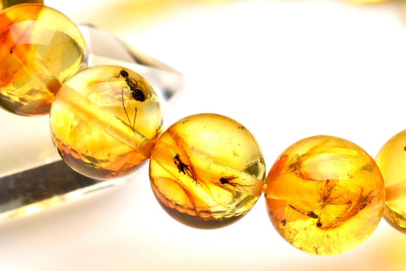 サイズ・種類も様々な昆虫が閉じ込められた天然琥珀のブレスレットです。