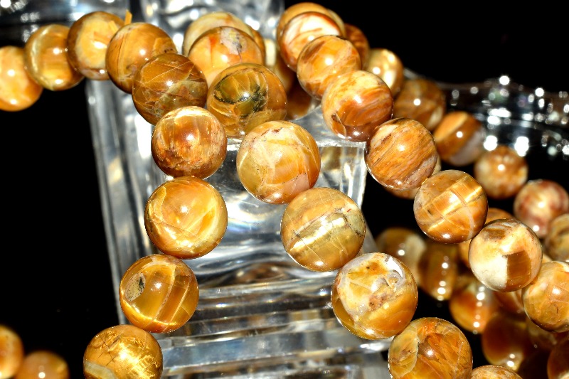 強い光に当てると美しいキャッツアイが浮かび上がる珠もあり幻想的です。