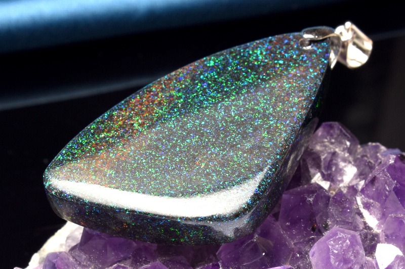 肉眼でも遊色は見られますが、強い光に当てると、まるで宇宙を見ているかのようにキラキラと煌めく美しいタイプ。