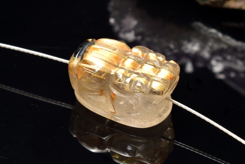 【1点物】板状金針 タイチンルチルクォーツ 13x8mm 貔貅彫刻(貫通穴) ビーズ _PC5149