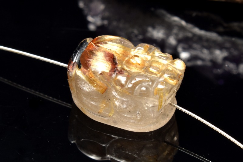 【1点物】板状金針 タイチンルチルクォーツ 14x10mm 貔貅彫刻(貫通穴) ビーズ _PC5150