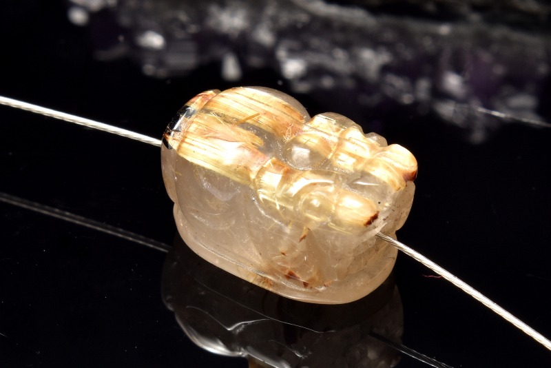 【1点物】板状金針 タイチンルチルクォーツ 13x9mm 貔貅彫刻(貫通穴) ビーズ _PC5151
