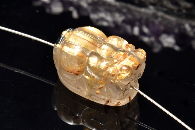 【1点物】板状金針 タイチンルチルクォーツ 14x9mm 貔貅彫刻(貫通穴) ビーズ _PC5154