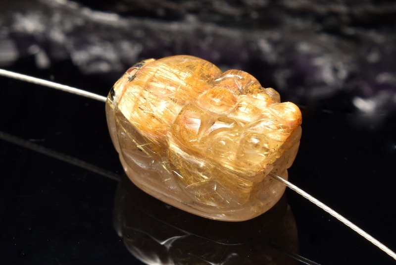 【1点物】板状金針 タイチンルチルクォーツ 15x11mm 貔貅彫刻(貫通穴) ビーズ _PC5157