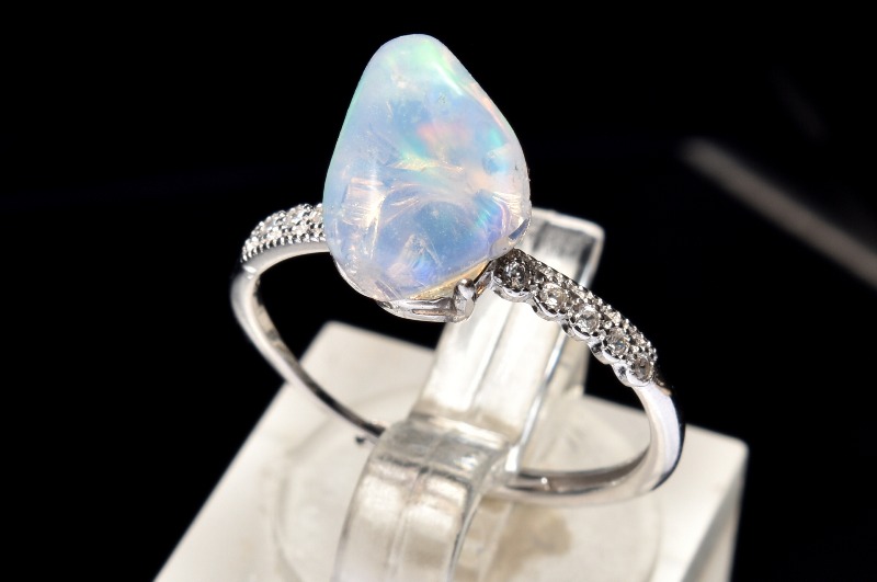 オパールの語源は、古代サンスクリット語の「宝石」を意味する「ウパラ」であるとされています。オパールは水中で微小な珪酸球が沈殿し、岩石の隙間などに密に蓄積して形成される石です。水晶等と同じく、珪素をメインにする鉱物ですが、その成り立ちから、水分が多く、硬度も非常に柔らかい石です。